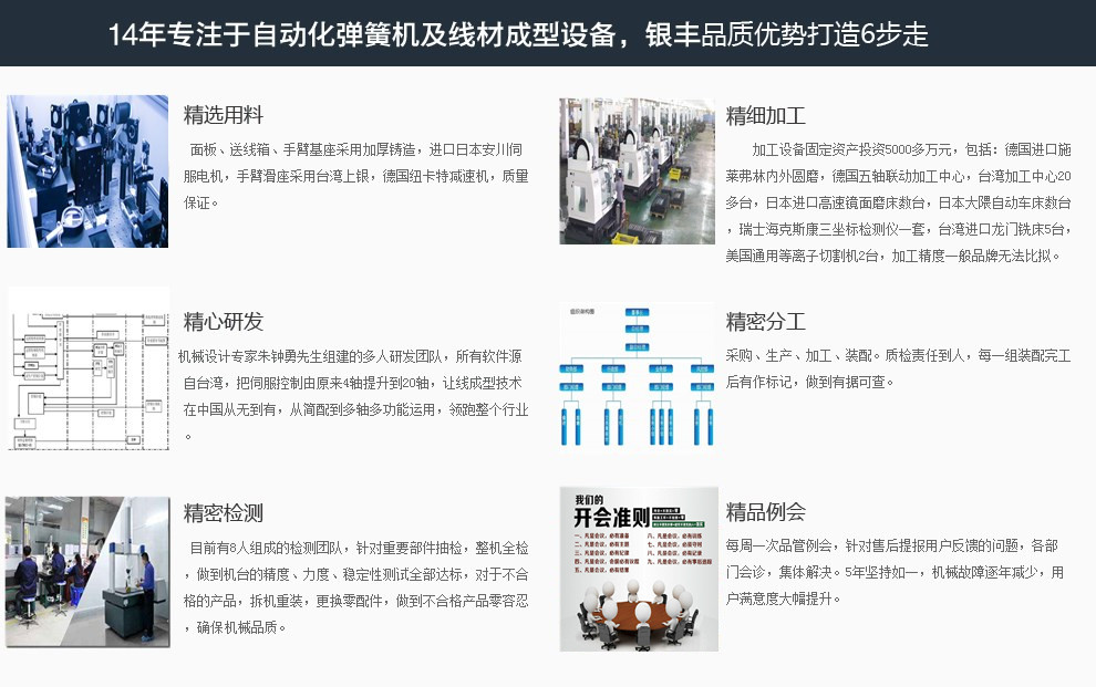 銀豐自動化科技(杭州)有限公司2014年成立于浙江杭州。是中國浙江專業生產彈簧機及線材折彎機的技術型企業。2014年公司運用日本新先進的伺服系列控制技術,進行一次次具有重要意義的技術改革,打破傳統的凸輪帶動成型模式,成為浙江省內能夠獨立生產無凸輪模式兼備機械手的彈簧機及轉線線材折彎機,目前公司每年銷售各類機型7百余臺,成為行業銷量領先的企業,也因為高性價比被廣大客戶群體追捧,同時也受到部分友商的詆毀。
